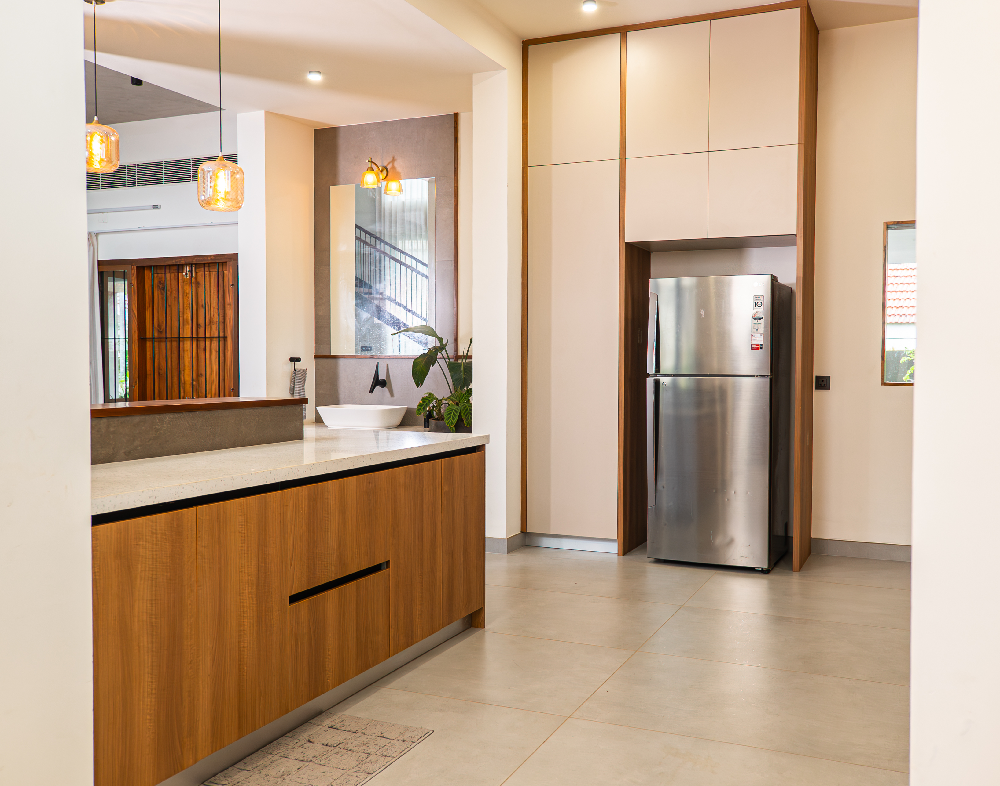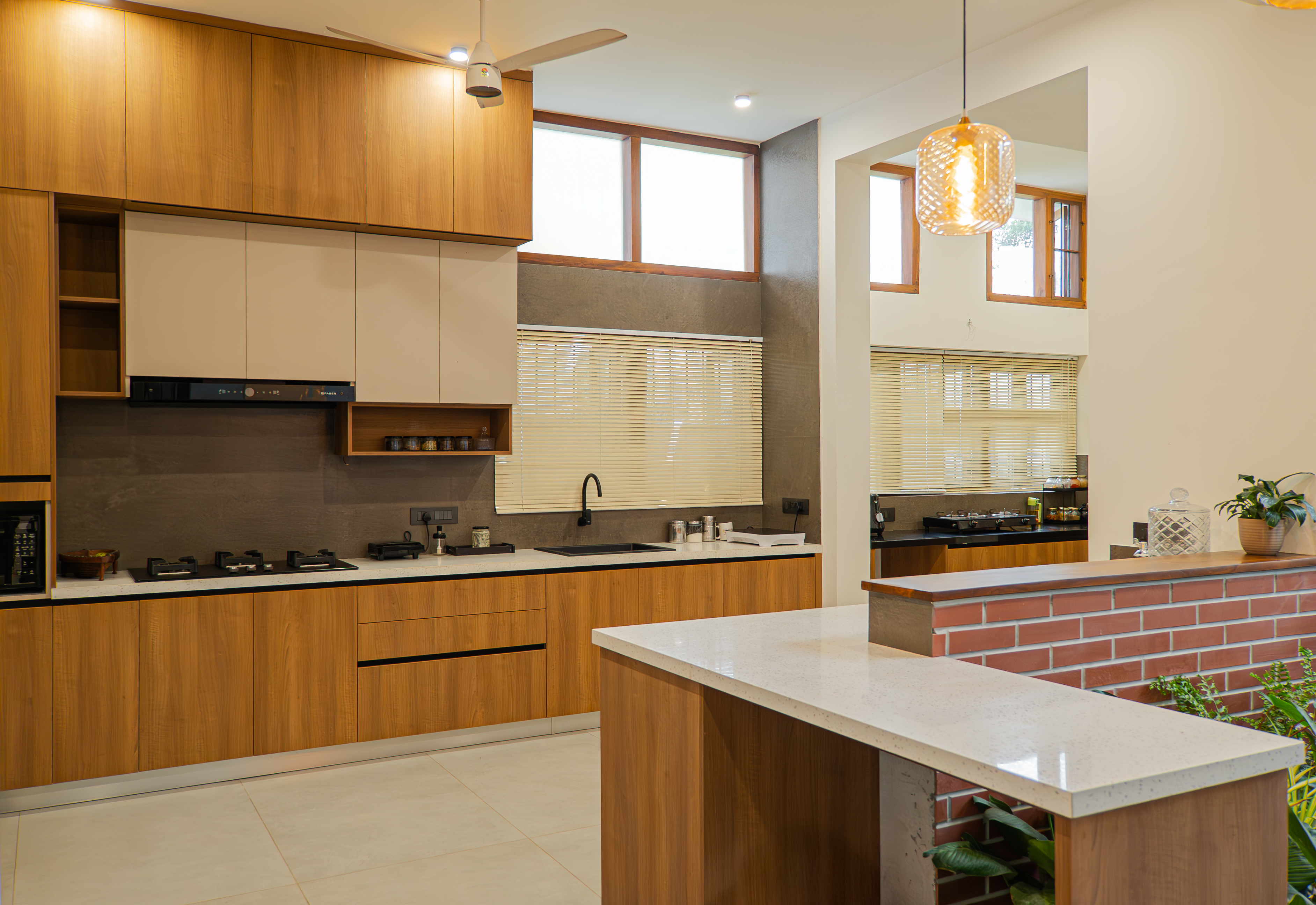 The kitchen in this architecturally crafted home is conceived as a serene, open space that complements the warm, earthy character of its brick-clad exterior. Embracing a minimalist design expression, the layout prioritizes openness and fluidity, ensuring the kitchen feels visually light and naturally connected to the surrounding living areas. Large windows and strategically placed openings draw in generous natural light, softening the clean geometry and enhancing the sense of airiness throughout the space. The material palette is intentionally subtle and refined. Light-toned surfaces, muted laminates, and soft-textured finishes create a balanced backdrop that contrasts gently with the home’s warm brick façade. Every element is thoughtfully curated from the sleek cabinetry lines to the unobtrusive hardware, ensuring nothing distracts from the calm, composed atmosphere. Storage is cleverly integrated into the architecture, with full-height cabinets and hidden compartments that maintain a clutter-free environment while maximizing functionality.